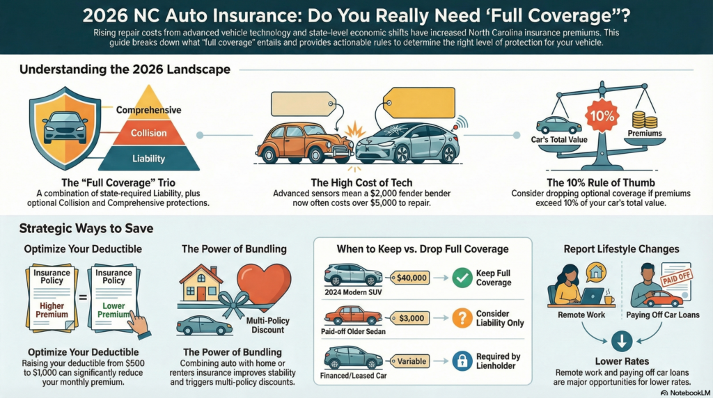 As we head into 2026, the conversation around full coverage has changed. It’s no longer just about picking a plan and forgetting it; it’s about understanding how modern vehicle technology, rising repair costs, and new state laws impact your wallet. Whether you are commuting to Fort Bragg or navigating the tree-lined streets of Haymount, this guide will help you determine the right level of protection for your lifestyle without overpaying for “fluff”.