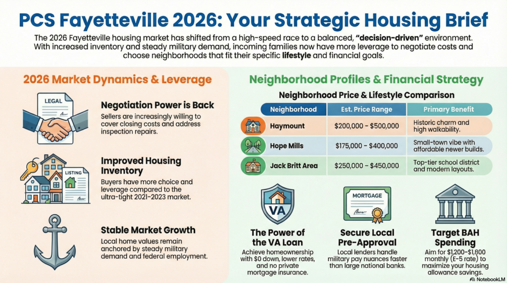 In previous years, buying a home near Fort Bragg felt like a race. However, for PCS Season 2026, we are seeing a shift toward a more balanced, “decision-driven” market. Success this year won’t come from outbidding everyone by thousands; it will come from having a better strategy.